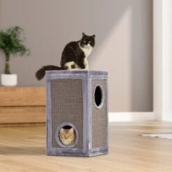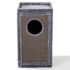 Die robust gefertigte Kratztonne von AniOne lässt sich durch ihr innovatives, dennoch schlichtem Design nahezu problemlos in jede Wohnumgebung integrieren und durch die eckige Form ideal und vor allem dadurch platzsparend in jede Zimmerecke platzieren. Die gesamte Kratztonne ist mit Natursisal umwickelt und animiert Ihre Katze dazu, ihren natürlichen Kratzisntsinkt zu befreideigen, was zugleich Ihre Möbel und Teppiche vor unschönen Kratzspuren schützt. Die beiden Höhlen laden Ihre Katze zum Spielen und ausgiebigen Verweilen ein. Die mit besonders weichem Plüsch-Stoff bezogenen Aussichtsplattform bietet Ihrer Katze einen besonder kuschilgen Platz um ihre Umgebung im Blick zu behalten.