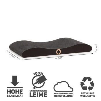 In der einzigartigen BLACK EDITION ist diese Kratzwelle ein ganz besonderer Eye-Catcher! Die Kratpappe ist dabei mit unbedenklicher Lebensmittelfarbe komplett durchgefärbt. Das CanadianCat-Logo schimmert in der BLACK EDITION in einem glänzendem Roségold.