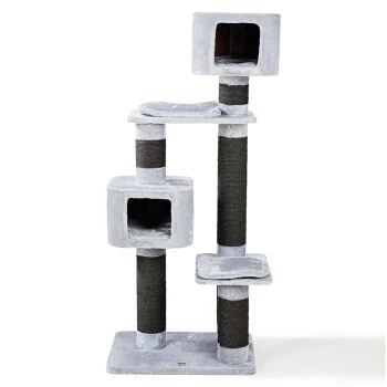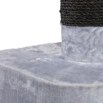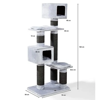 Der Kratzbaum hat fünf Ebenen, die komlett mit Plüsch überzogen sind. Er hat zwei Höhlen, die mit einem Plüschkissen ausgestattet sind, und zwei Liegebretter, die ebenfalls mit einem Plüschkissen ausgelegt sind. Alle Kissen werden mittels Klettband an den Liegebrettern und in den Höhlen befestigt. Die Kratzstämme haben einen Durchmesser von 14cm und sind mit robustem, natürlichen Sisal umwickelt und verklebt. An den Enden sind diese mit Plüsch unrandet.