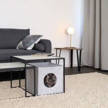 Wenn du an einer Alternative für die gängigen Katzenbetten interessiert bist, ist die lionto Katzenhöhle eine ideale Lösung. Die würfelförmige Kuschelhöhle aus warmem und stabilem Filz beinhaltet einen Eingang mit einem Durchmesser von 17 cm und einer Wanddicke von 5 mm. So kann der faltbare Katzenwürfel ohne Bedenken als Katzenbettchen und Rückzugsort genutzt werden und vermittelt deiner Katze ein sicheres Gefühl und Wohlbehagen. Die Maße betragen 33x37x33 cm und somit ist diese Filzhöhle für einige gängige Regale wie beispielsweise dem Ikea Kallax oder Ikea Expedit Regal geeignet. Wenn du die Höhle in ein passendes Regal stellst, werden besonders Katzen, die sich gerne zurückziehen, voll auf ihre Kosten kommen. Natürlich macht die Katzenhöhle auch freistehend etwas her und bietet immer einen gemütlichen Schlafplatz. Wir bieten diesen Filzwürfel in den Farben hellgrau und dunkelgrau und wahlweise mit einem weichen Liegekissen oder ohne Kissen an. Der Bezug des Liegekissens kann zur Reinigung abgenommen werden.