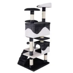 Mit diesem Katzenspielhaus mit weichem Plüsch und viel Sisal bleiben keine Wünsche Ihrer Samtpfote offen. Die kuscheligen Höhlen und gemütlichen Liegeplateaus sind ideal für die Ruhephasen und das Beobachten der Umgebung geeignet. Die beweglichen Plüschbälle und eine Treppe sorgen für den nötigen Spiel- und Kletterspaß. Die Stämme mit robustem Sisal unterstützen die Krallenpflege und halten Ihre Katze somit von den Möbeln fern.
