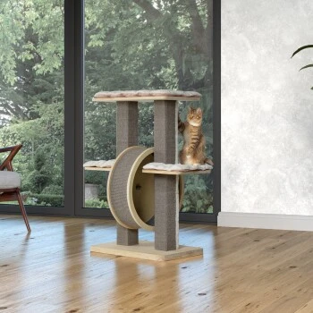 Der MORE Kratzbaum Camilla sticht insbesondere durch sein großes Kratzrad hervor, das viel Abwechslung bei der täglichen Krallenpflege bietet und für großen Beschäftigungsspaß sorgt. Auf zwei verschiedenen Ebenen findet Ihr Stubentiger ausreichend bequeme Liegeflächen, deren kuschelige Liegekissen sich ganz einfach abnehmen und bei 30° waschen lassen. Der Kratzbaum überzeugt außerdem durch seine außergewöhnlichen Kratzstämme in quadratischer Form, die mit hochwertigem grauen Sisal versehen sind und so langfristigen Kratzspaß gewährleisten. Gefertigt aus umweltfreundlichem Kiefernholz, ist der MORE Kratzbaum Camilla nicht nur sehr stabil und langlebig sondern bietet selbst größeren Katzen eine Ruheoase zum Entspannen, Beobachten und Kratzen.