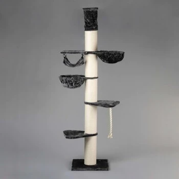 Mit seinen 20 cm dicken Sisalpfählen, der beschwerten Bodenplatte von 60 x 60 cm und dem starken Deckenspanner ist dieser hohe Kratzbaum äußerst stabil. Dieses Modell ist robust genug für mehrere, schwere Katzen wie Maine Coon oder Ragdoll.