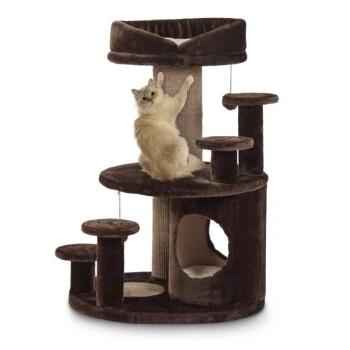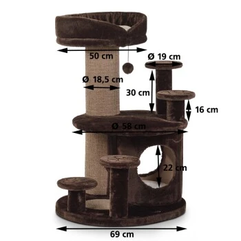 Die vier gepolsterten Aufstiegshilfen zeichnen diesen Kratzbaum aus und ermöglichen gerade älteren Katzen das problemlose Erreichen der höheren Ebenen. Der mit Natursisal ummantelte, große Stamm, sowie die Kratzfläche der Bodenplatte, befriedigen das natürliche Kratzverhalten Ihres Stubentigers. Die gepolsterten Liegeplatten verschaffen eine hervorragende Aussicht und laden zum ausgiebigen Verweilen ein. Die Höhle mit Wendekissen ist der ideale, kuschelige Rückzugsort. Die obere, große Liegeplatte verfügt zudem über ein abnehmbares Kuschelbett.